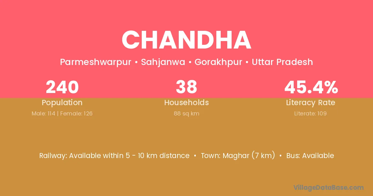 The literacy rate of Chandha village is 35.28%. Male literacy stands at 45.37% and female literacy at 26.19%.