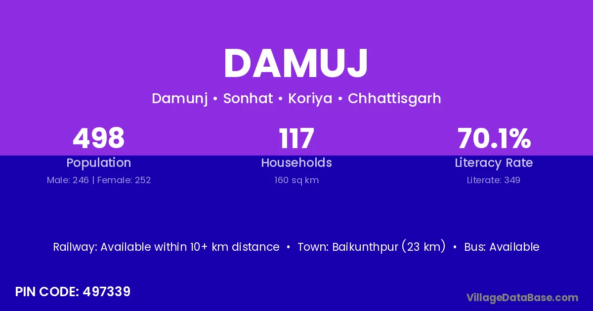 Baikunthpur (23 km) is the nearest town to Damuj village for major economic activities and is located approximately 23 km away.
