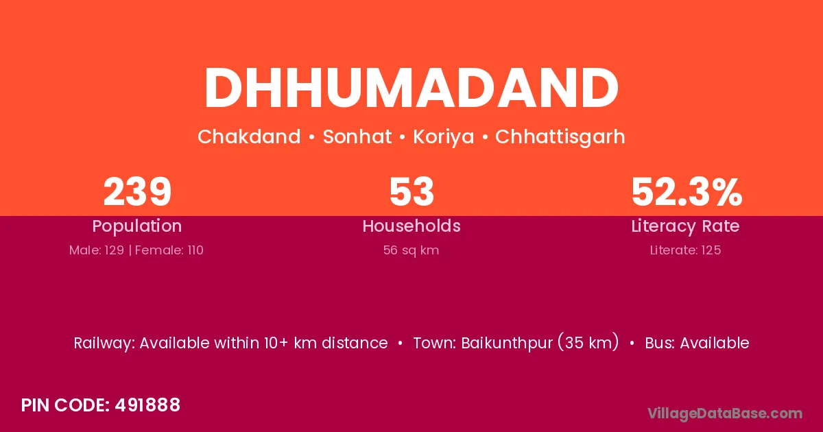 Baikunthpur (35 km) is the nearest town to Dhhumadand village for major economic activities and is located approximately 35 km away.