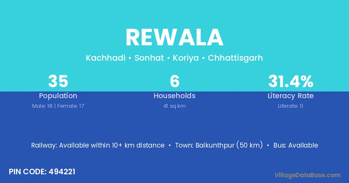 Rewala village has a total population of 35 people, of which 18 are males and 17 are females.