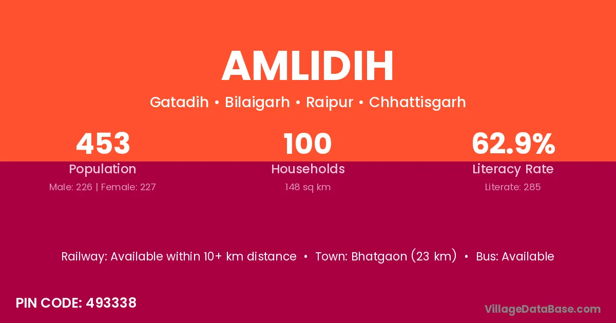 Bagbahara (22 km) is the nearest town to Amlidih village for major economic activities and is located approximately 22 km away.