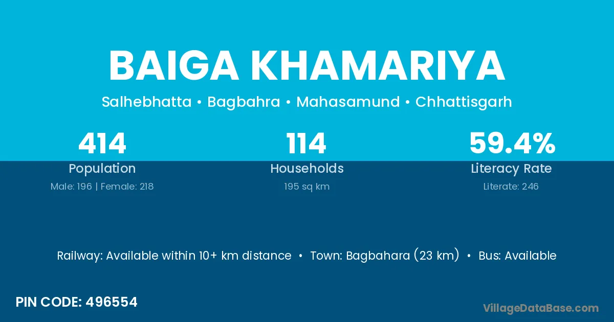 Bagbahara (23 km) is the nearest town to Baiga Khamariya village for major economic activities and is located approximately 23 km away.