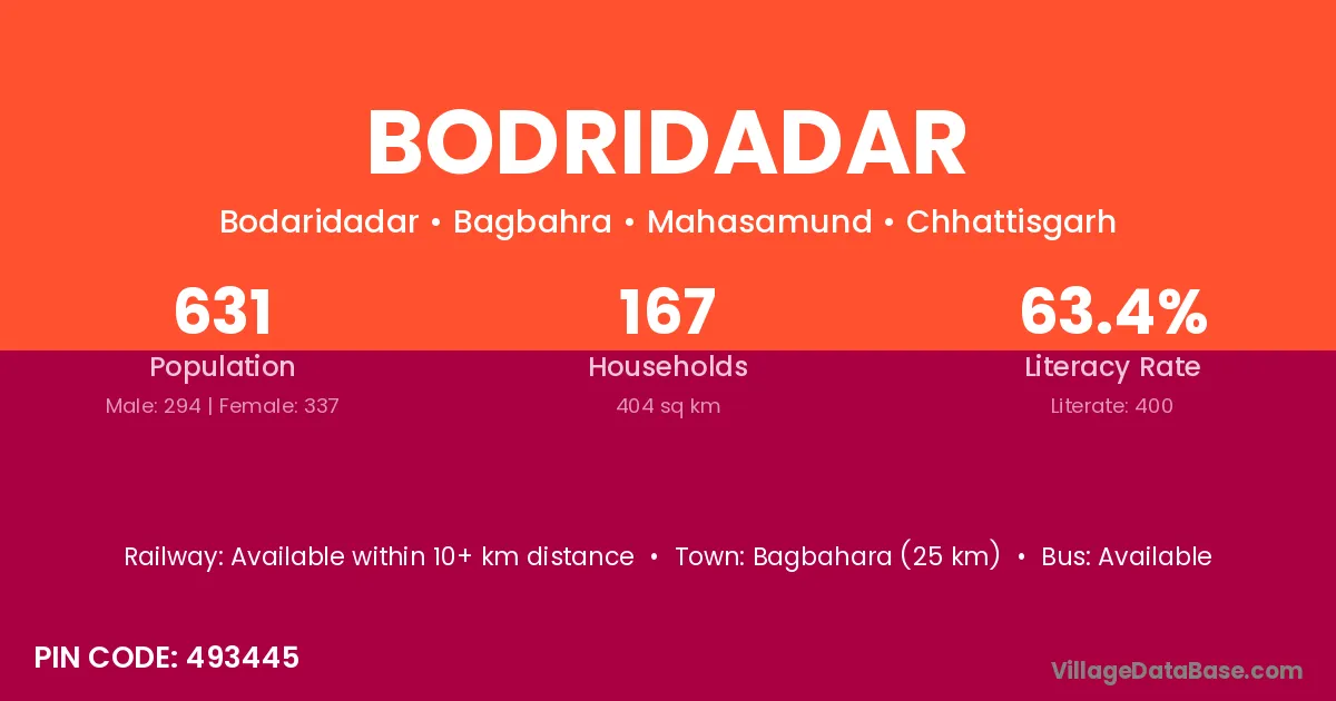 Bagbahara (25 km) is the nearest town to Bodridadar village for major economic activities and is located approximately 25 km away.