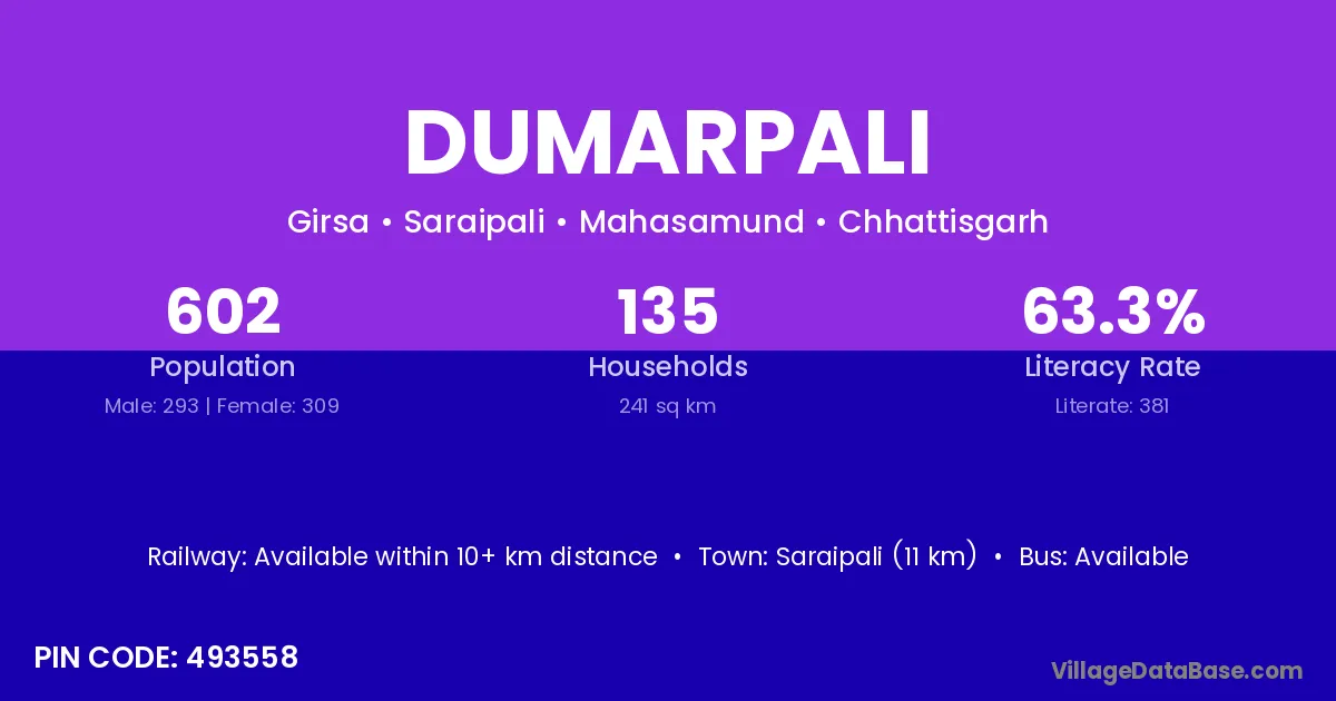 Dumarpali village has a total population of 1,244 people, of which 634 are males and 610 are females.
