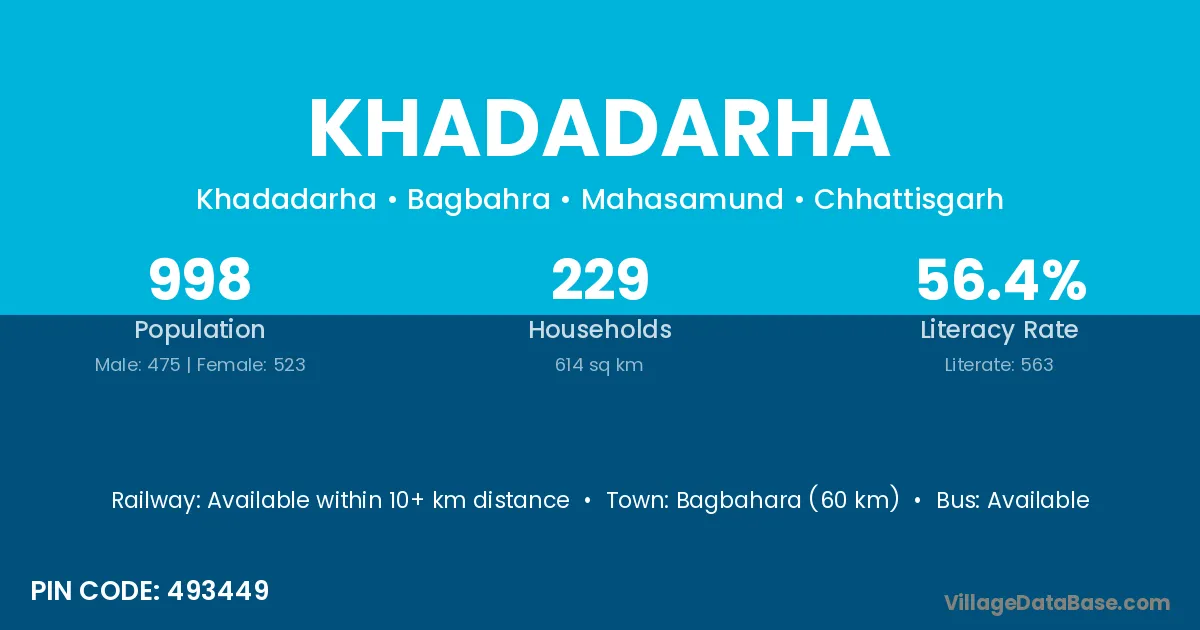 Bagbahara (60 km) is the nearest town to Khadadarha village for major economic activities and is located approximately 60 km away.