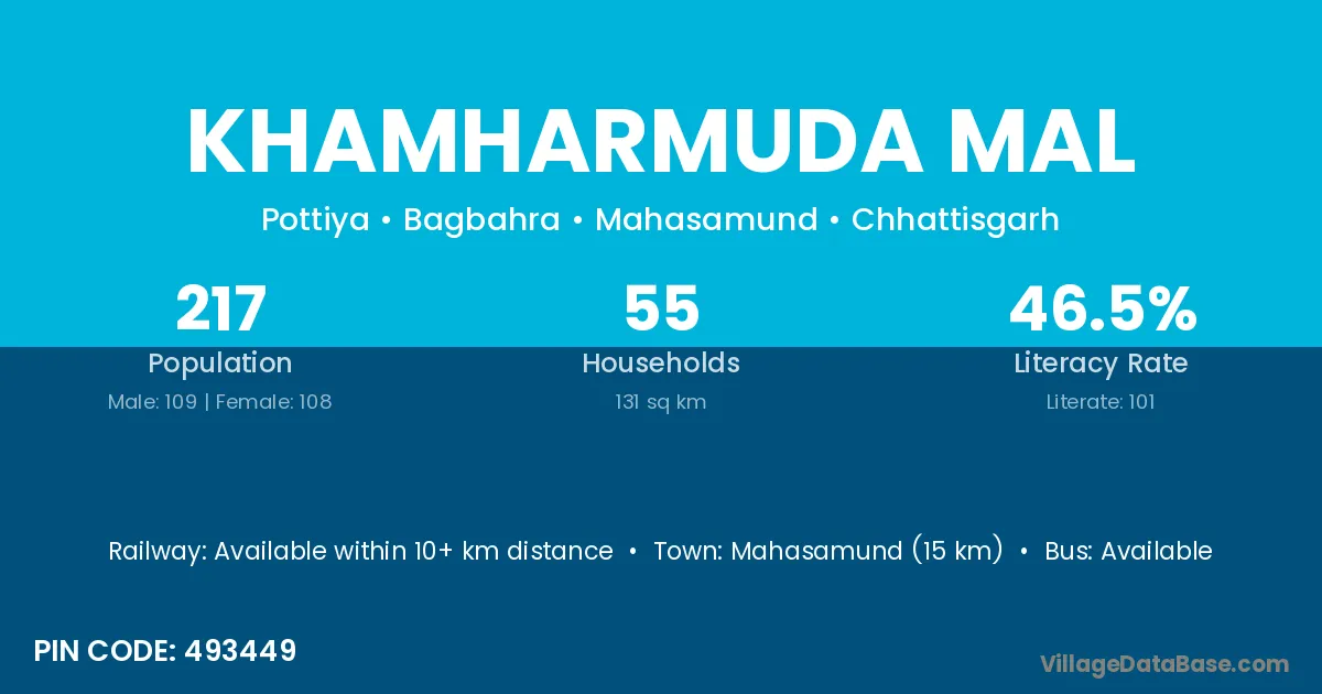 Mahasamund (15 km) is the nearest town to Khamharmuda Mal village for major economic activities and is located approximately 15 km away.