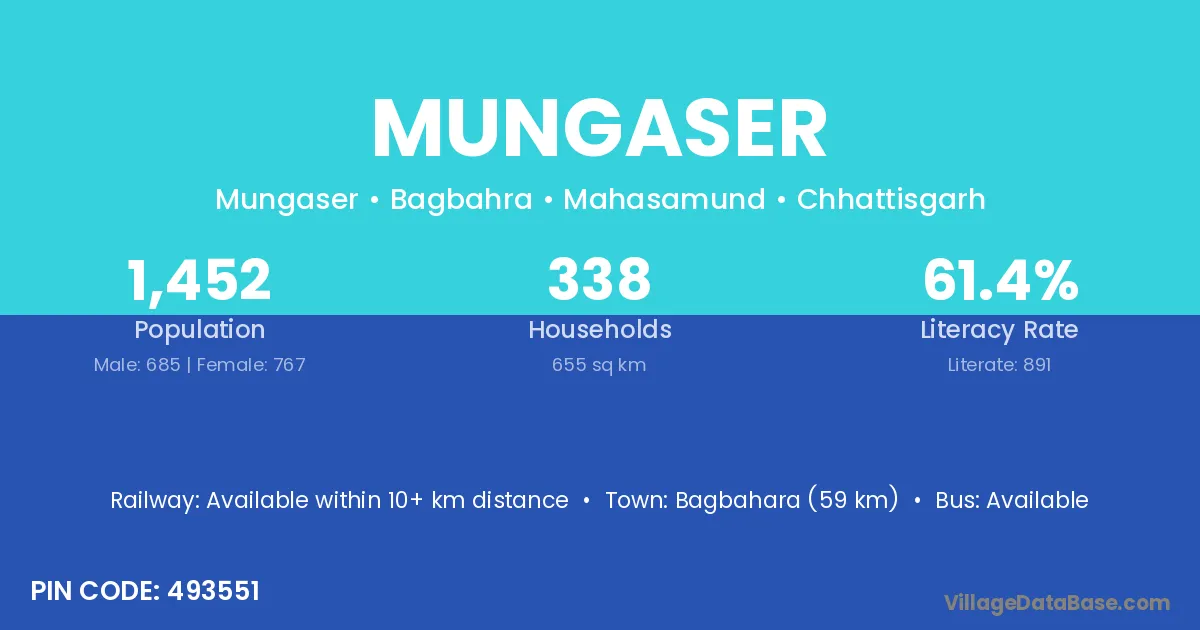 Bagbahara (59 km) is the nearest town to Mungaser village for major economic activities and is located approximately 59 km away.