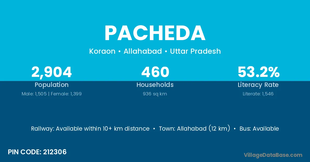 The literacy rate of Pacheda village is 58.24%. Male literacy stands at 68.38% and female literacy at 47.79%.