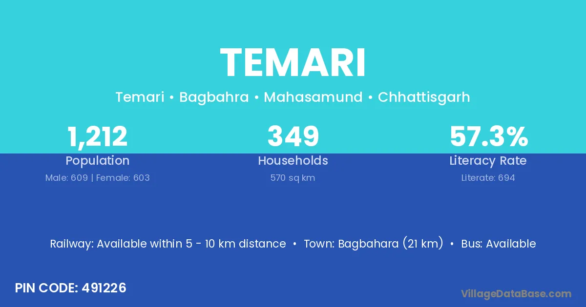 Temari village has a total population of 1,212 people, of which 609 are males and 603 are females.