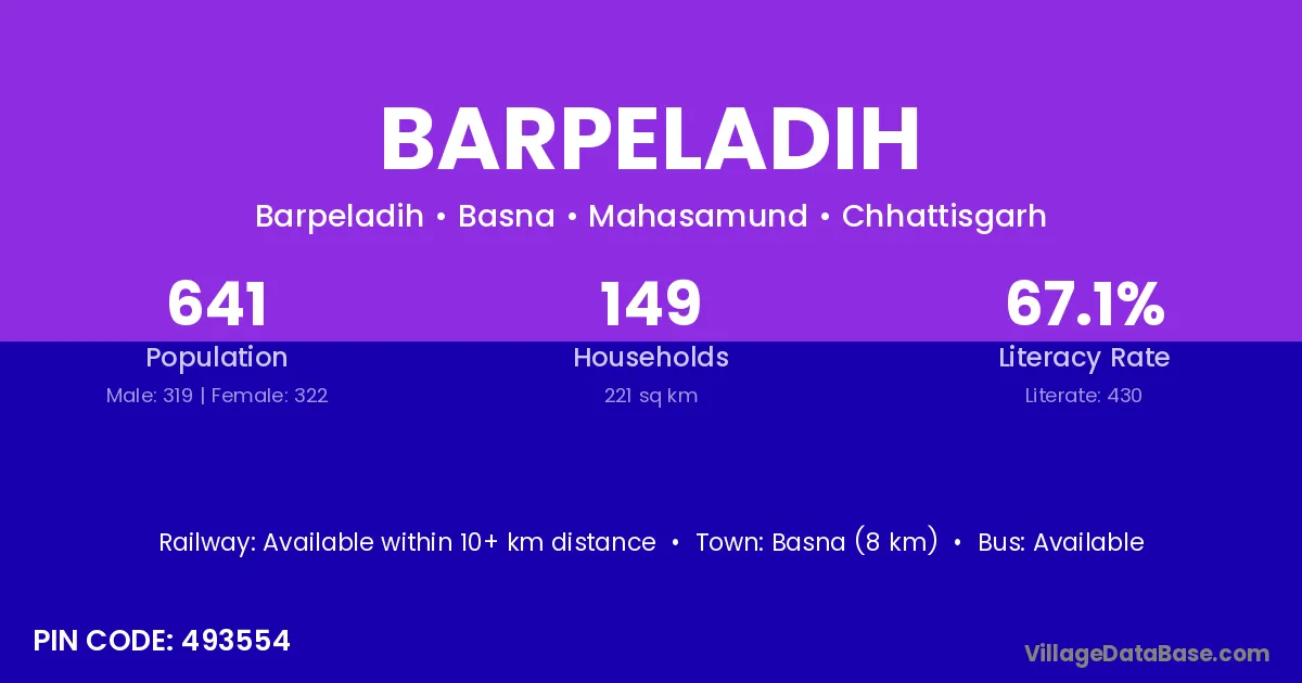 Basna (8 km) is the nearest town to Barpeladih village for major economic activities and is located approximately 8 km away.