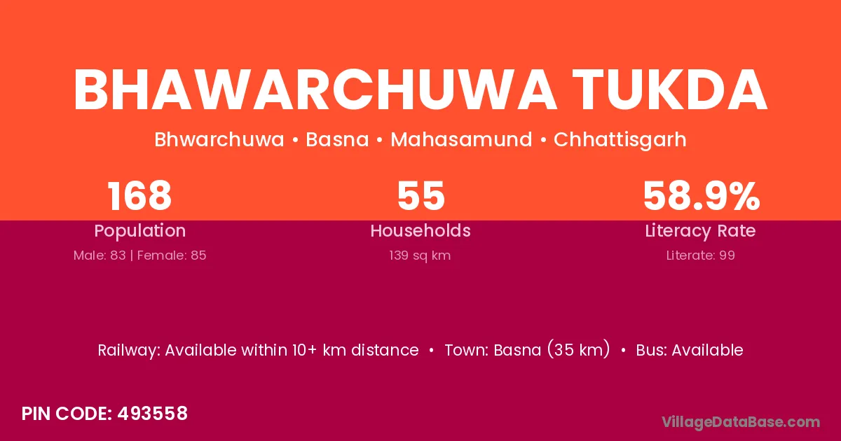 Bhawarchuwa Tukda village has a total population of 168 people, of which 83 are males and 85 are females.