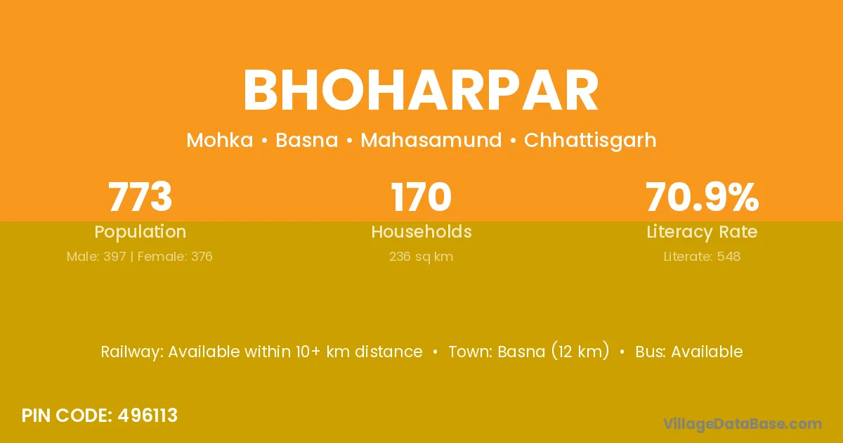 Basna (12 km) is the nearest town to Bhoharpar village for major economic activities and is located approximately 12 km away.