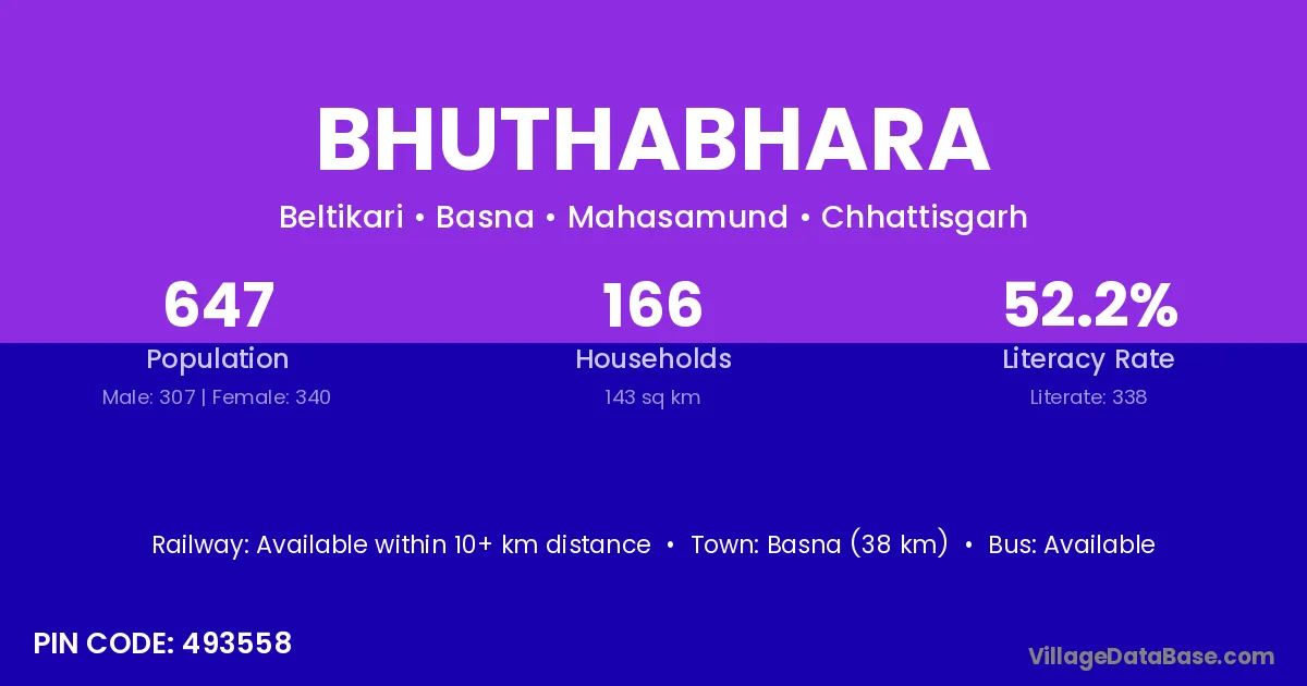 Bhuthabhara village has a total population of 647 people, of which 307 are males and 340 are females.