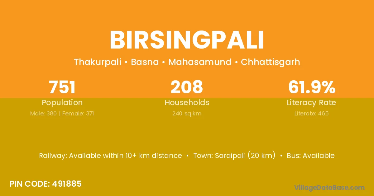 Birsingpali village has a total population of 751 people, of which 380 are males and 371 are females.