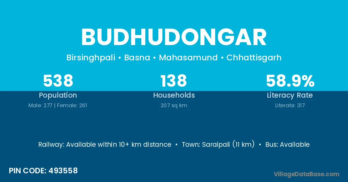Saraipali (11 km) is the nearest town to Budhudongar village for major economic activities and is located approximately 11 km away.