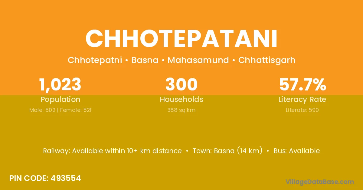 Chhotepatani village has a total population of 1,023 people, of which 502 are males and 521 are females.