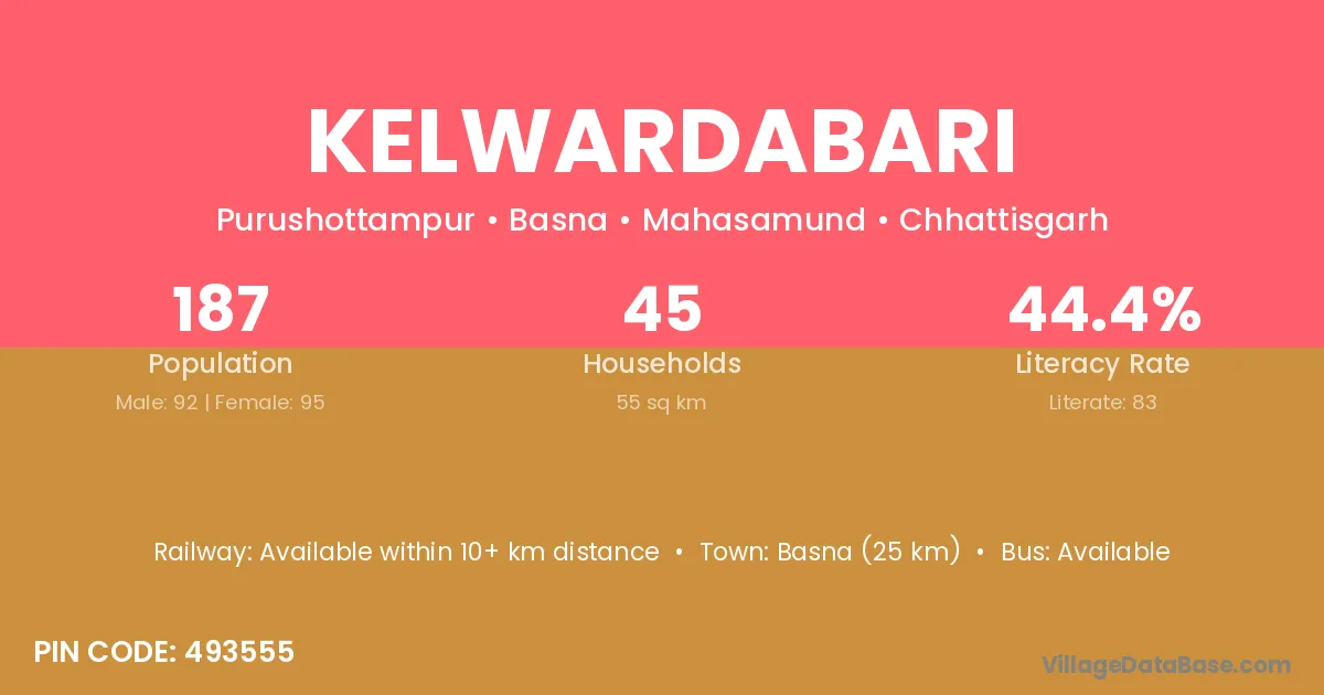 Kelwardabari village has a total population of 187 people, of which 92 are males and 95 are females.