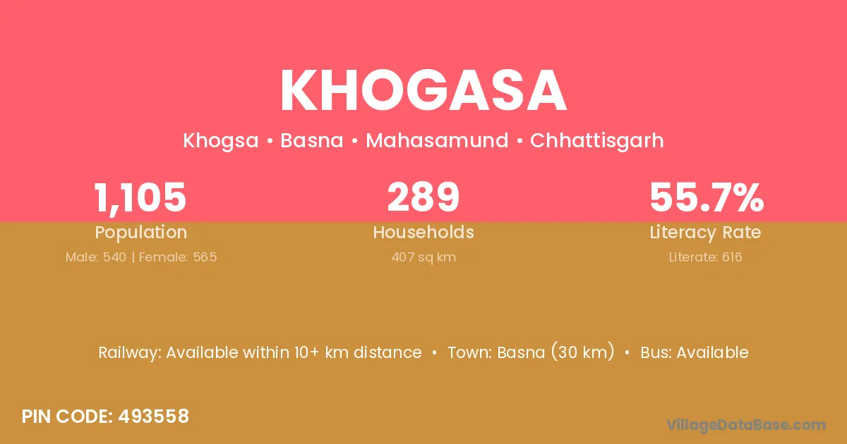 Khogasa village has a total population of 1,105 people, of which 540 are males and 565 are females.