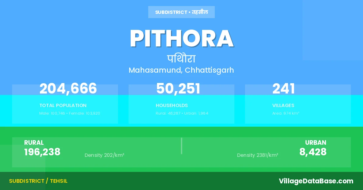 According to the 2011 census The total area of Pithora Tehsil is 974 km², with a population of 204666 people. The population density is 210 inhabitants per square kilometre, and there are approximately 50251 houses in the sub district.