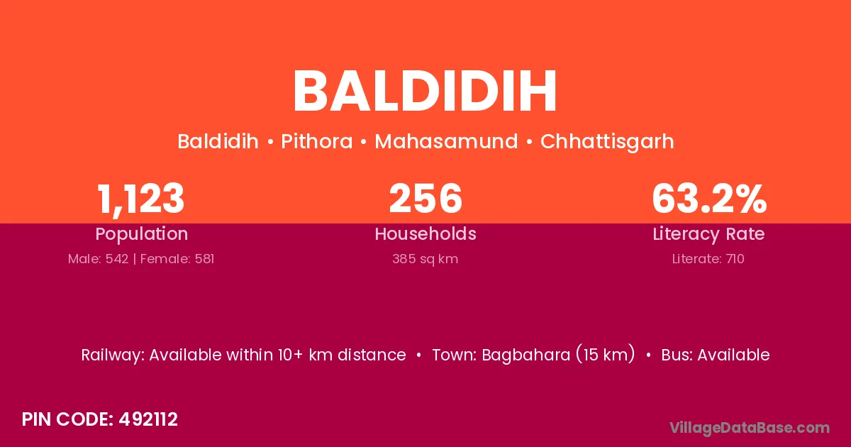 Bagbahara (15 km) is the nearest town to Baldidih village for major economic activities and is located approximately 15 km away.