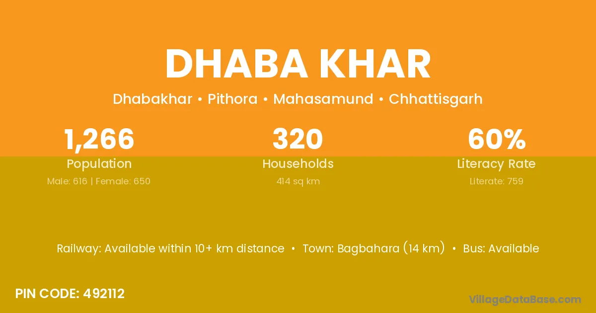 Bagbahara (14 km) is the nearest town to Dhaba Khar village for major economic activities and is located approximately 14 km away.