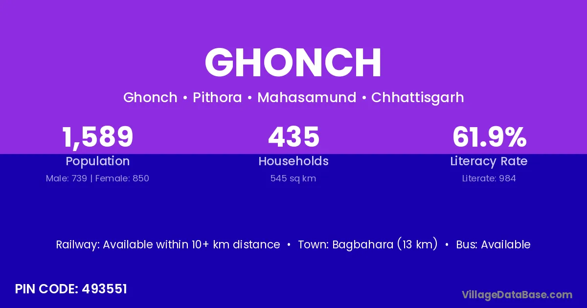 Bagbahara (13 km) is the nearest town to Ghonch village for major economic activities and is located approximately 13 km away.