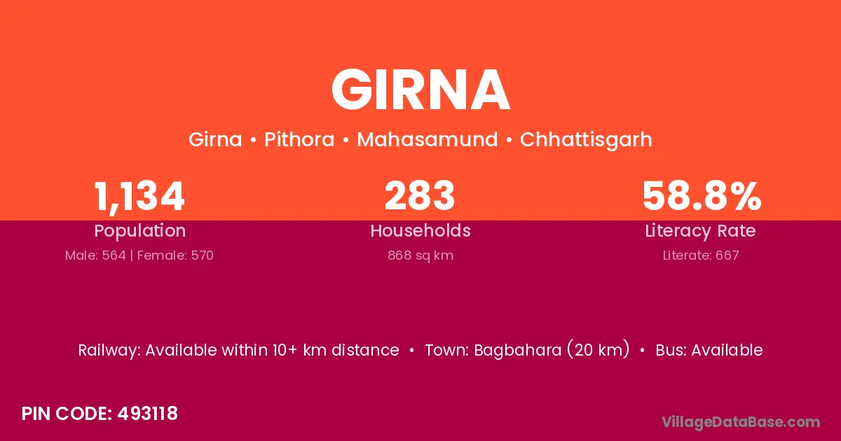 Bagbahara (20 km) is the nearest town to Girna village for major economic activities and is located approximately 20 km away.