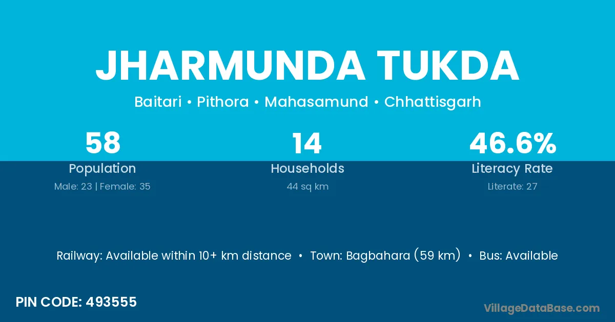 Bagbahara (59 km) is the nearest town to Jharmunda Tukda village for major economic activities and is located approximately 59 km away.