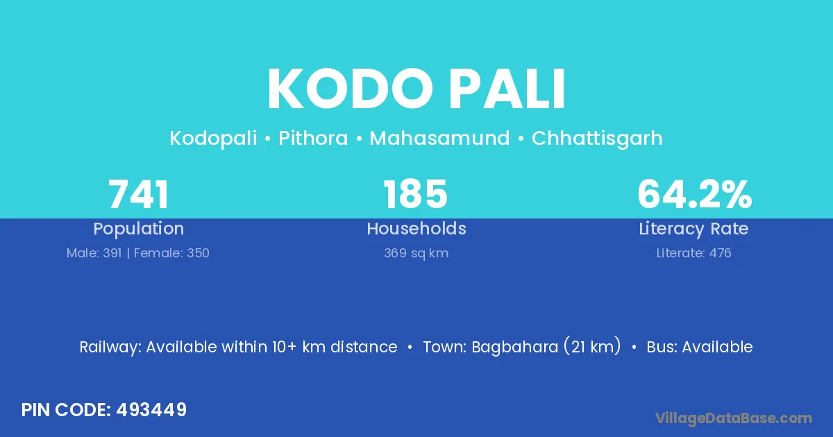 Bagbahara (21 km) is the nearest town to Kodo Pali village for major economic activities and is located approximately 21 km away.