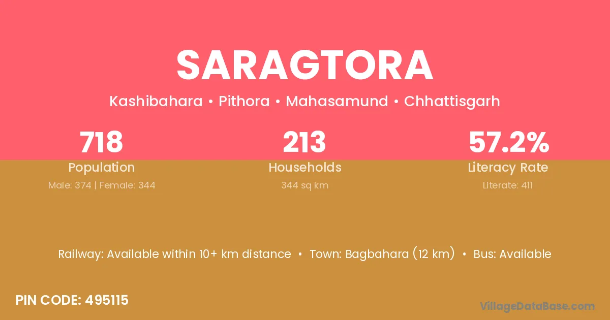 Bagbahara (12 km) is the nearest town to Saragtora village for major economic activities and is located approximately 12 km away.