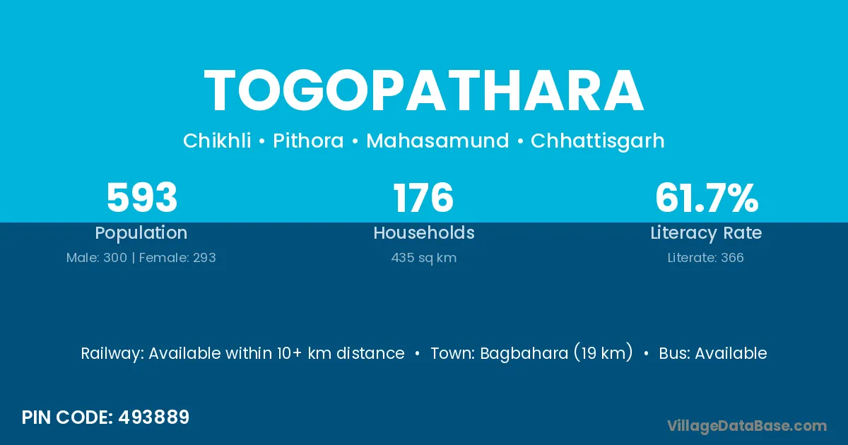 Bagbahara (19 km) is the nearest town to Togopathara village for major economic activities and is located approximately 19 km away.