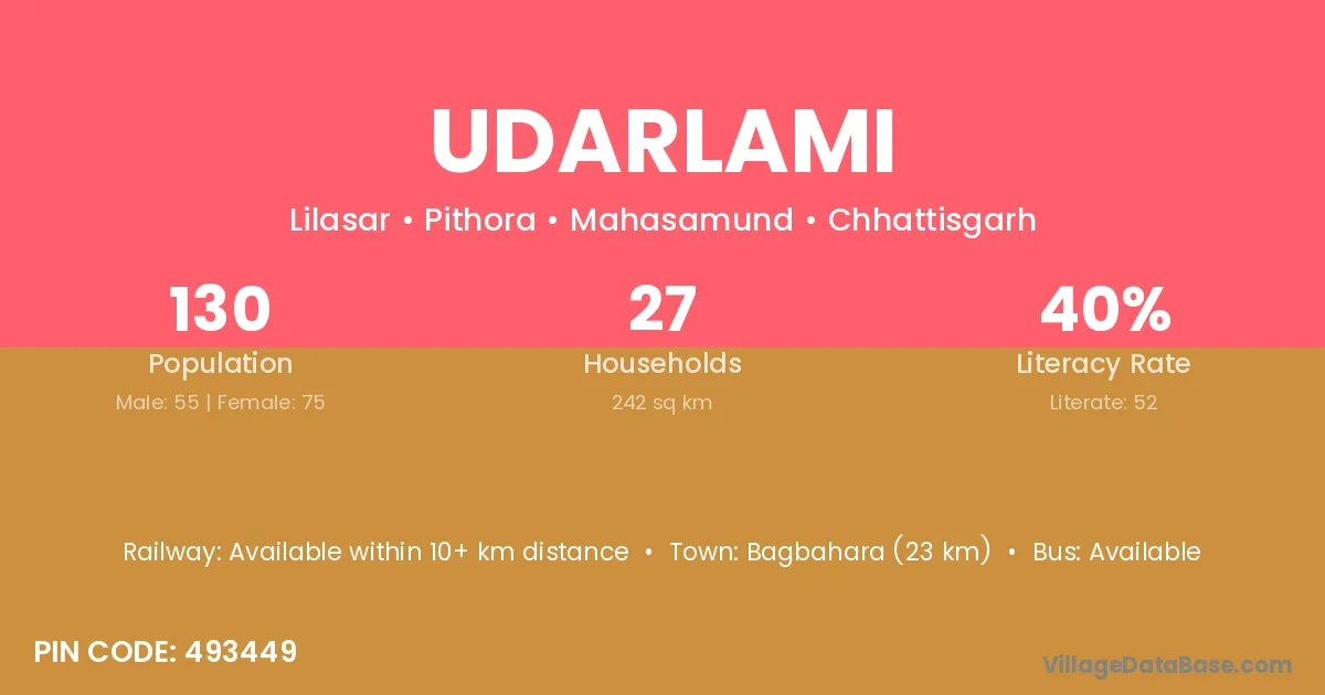 Bagbahara (23 km) is the nearest town to Udarlami village for major economic activities and is located approximately 23 km away.