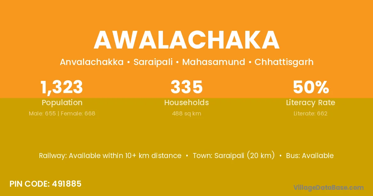 Saraipali (20 km) is the nearest town to Awalachaka village for major economic activities and is located approximately 20 km away.
