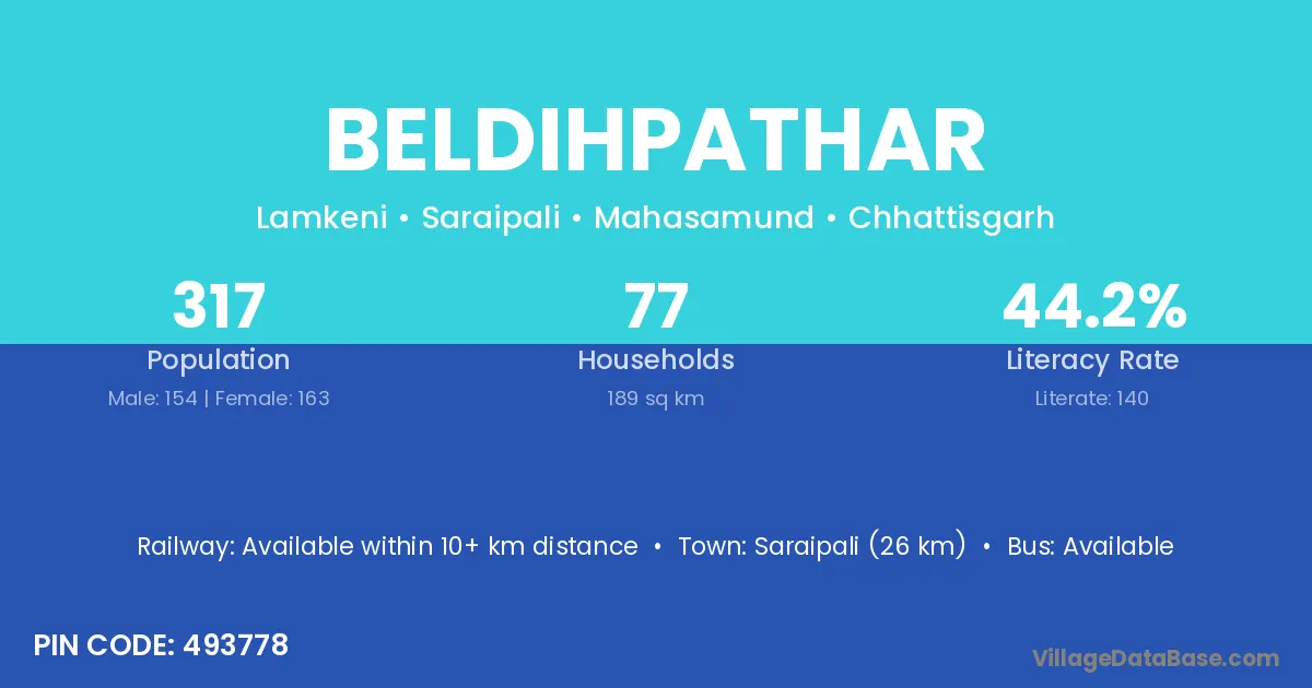Saraipali (26 km) is the nearest town to Beldihpathar village for major economic activities and is located approximately 26 km away.