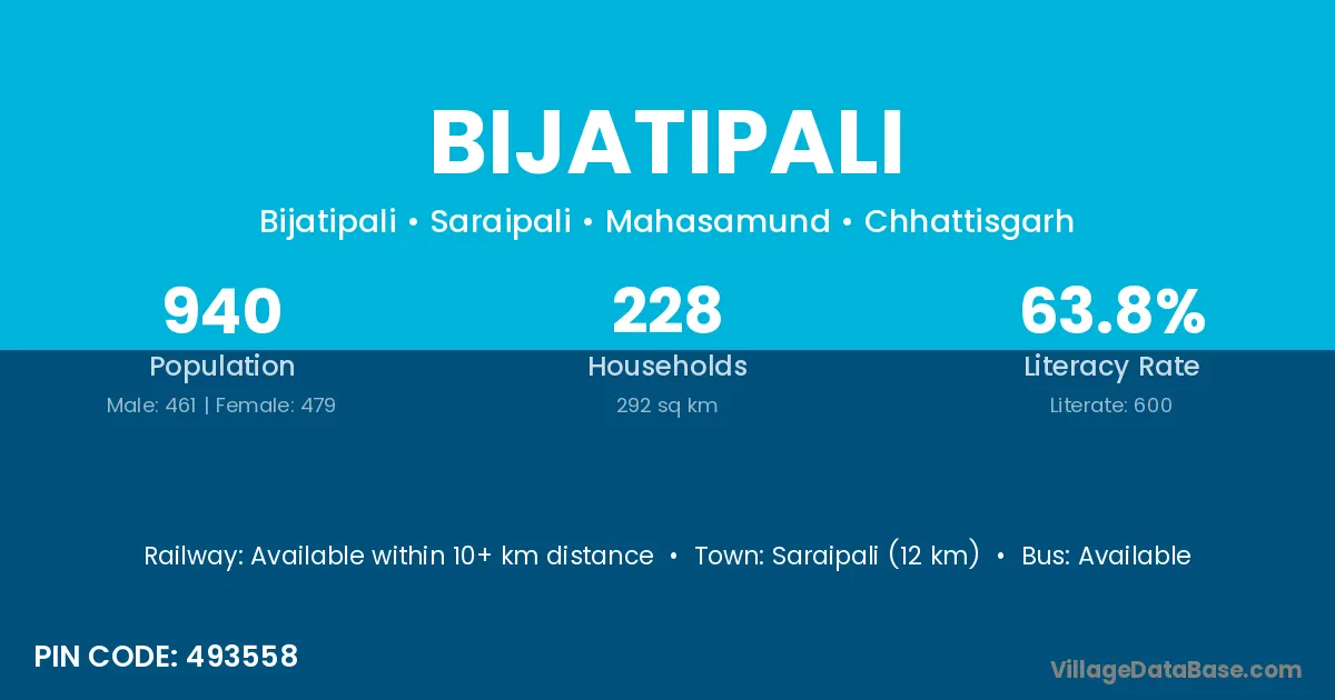 Saraipali (12 km) is the nearest town to Bijatipali village for major economic activities and is located approximately 12 km away.