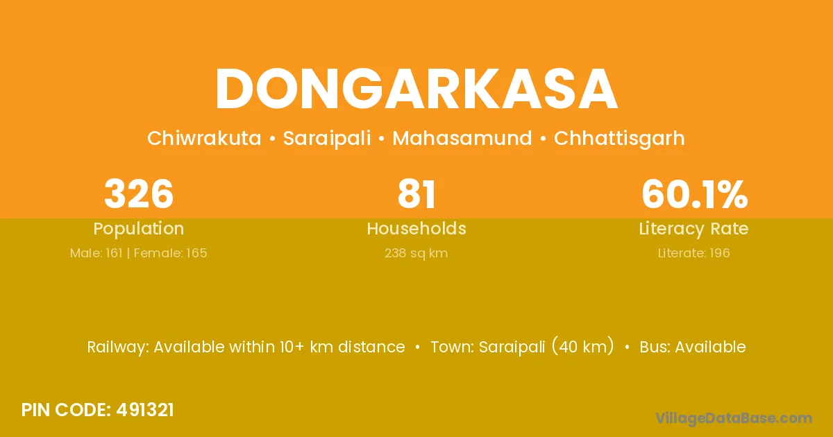 Saraipali (40 km) is the nearest town to Dongarkasa village for major economic activities and is located approximately 40 km away.