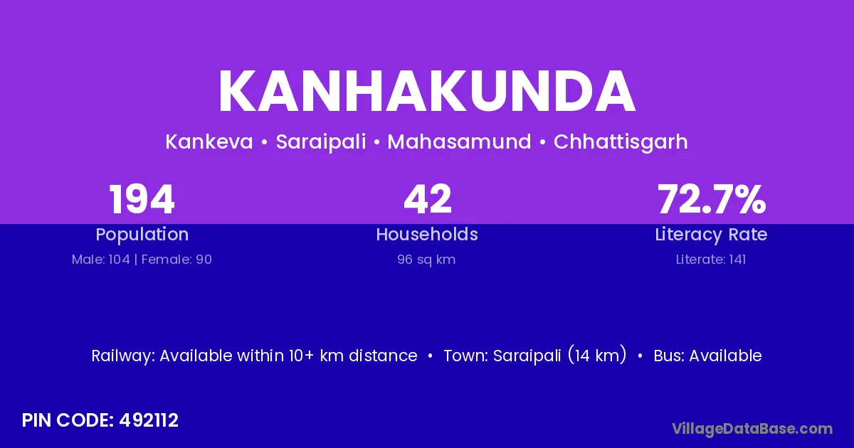 Saraipali (14 km) is the nearest town to Kanhakunda village for major economic activities and is located approximately 14 km away.