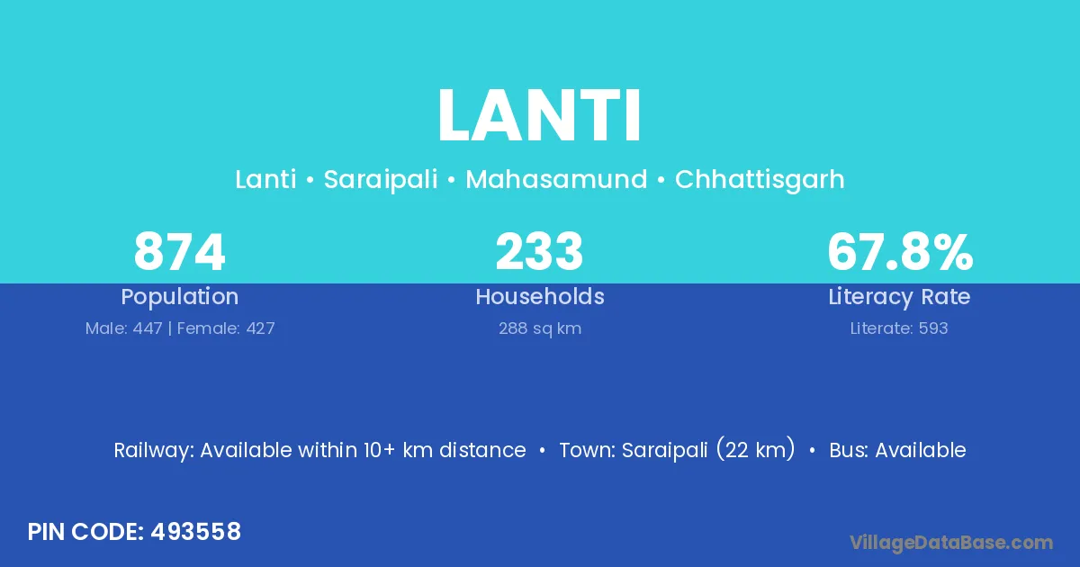 Saraipali (22 km) is the nearest town to Lanti village for major economic activities and is located approximately 22 km away.