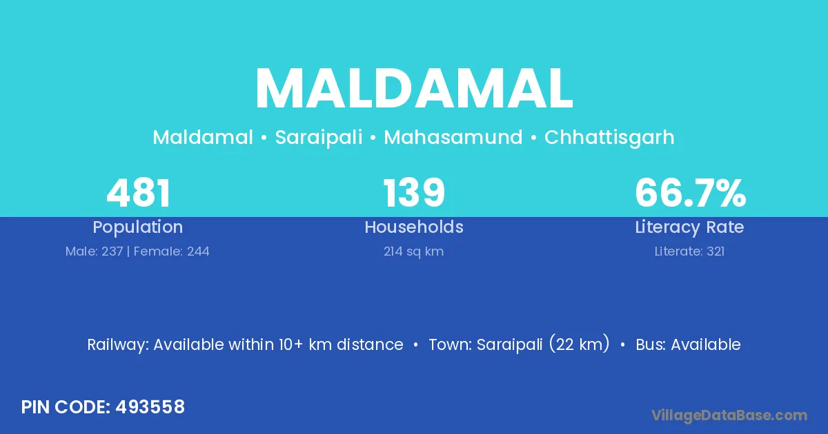 Saraipali (22 km) is the nearest town to Maldamal village for major economic activities and is located approximately 22 km away.