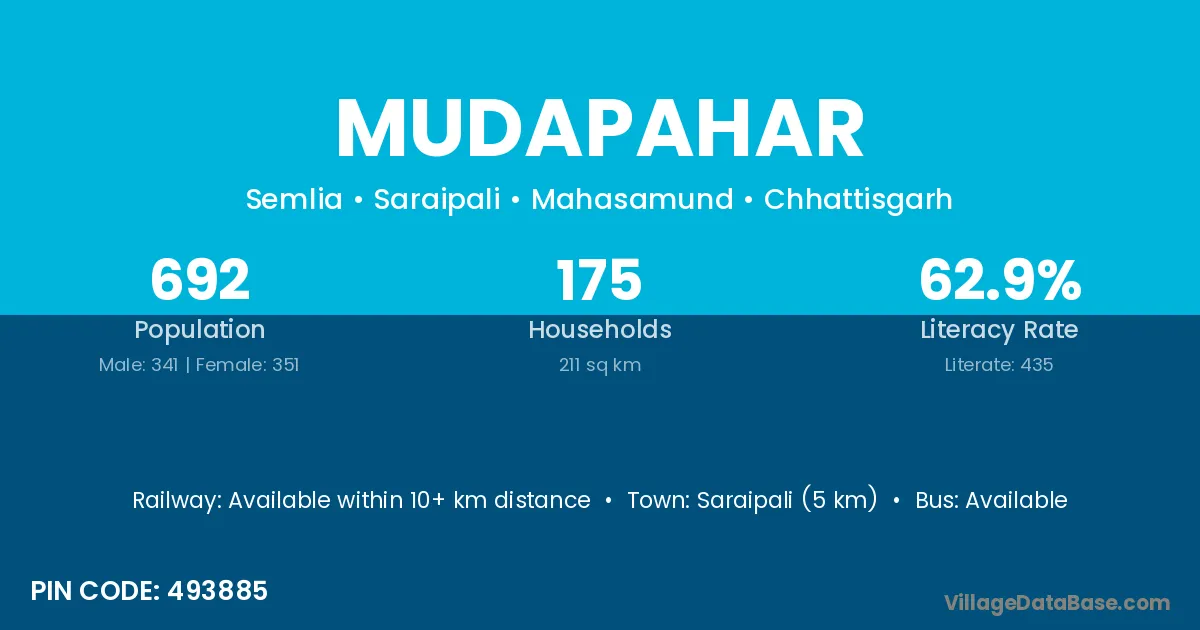 Saraipali (5 km) is the nearest town to Mudapahar village for major economic activities and is located approximately 5 km away.