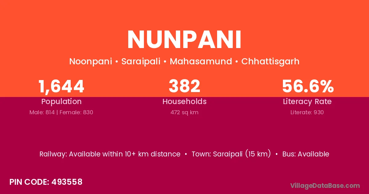 Saraipali (15 km) is the nearest town to Nunpani village for major economic activities and is located approximately 15 km away.