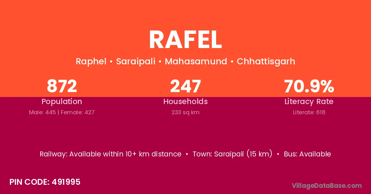 Saraipali (15 km) is the nearest town to Rafel village for major economic activities and is located approximately 15 km away.