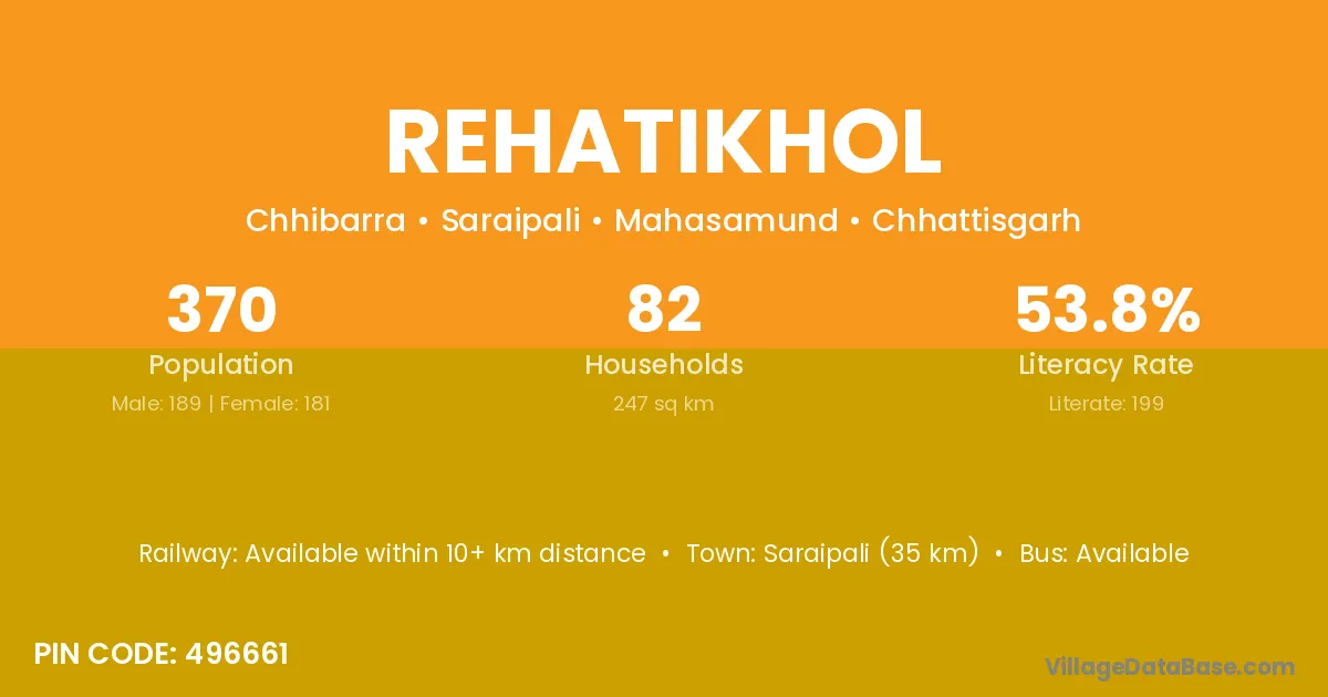 Saraipali (35 km) is the nearest town to Rehatikhol village for major economic activities and is located approximately 35 km away.