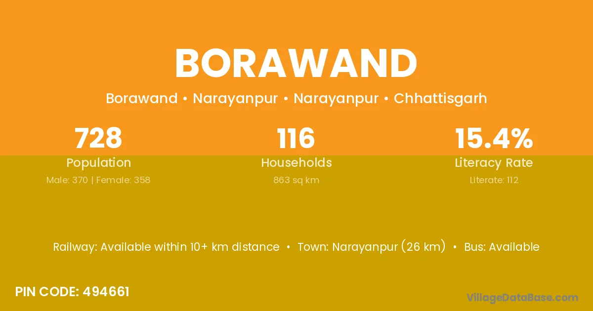 Narayanpur (26 km) is the nearest town to Borawand village for major economic activities and is located approximately 26 km away.