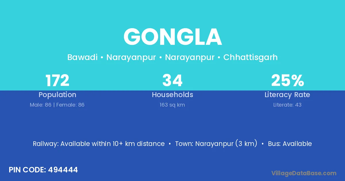 Narayanpur (3 km) is the nearest town to Gongla village for major economic activities and is located approximately 3 km away.