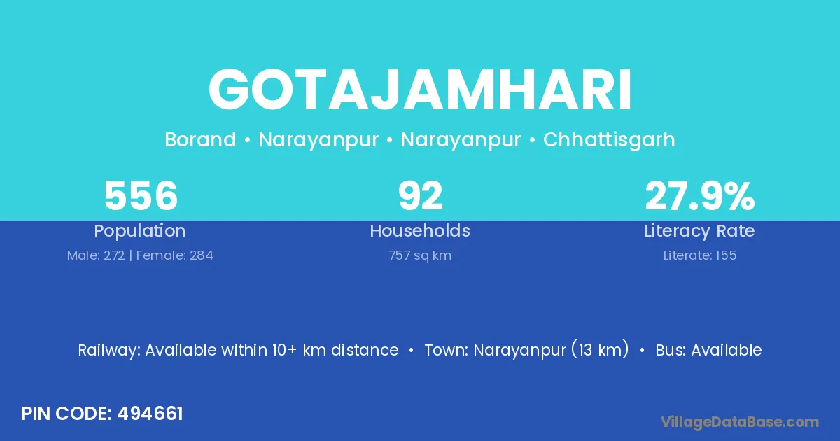 Narayanpur (13 km) is the nearest town to Gotajamhari village for major economic activities and is located approximately 13 km away.