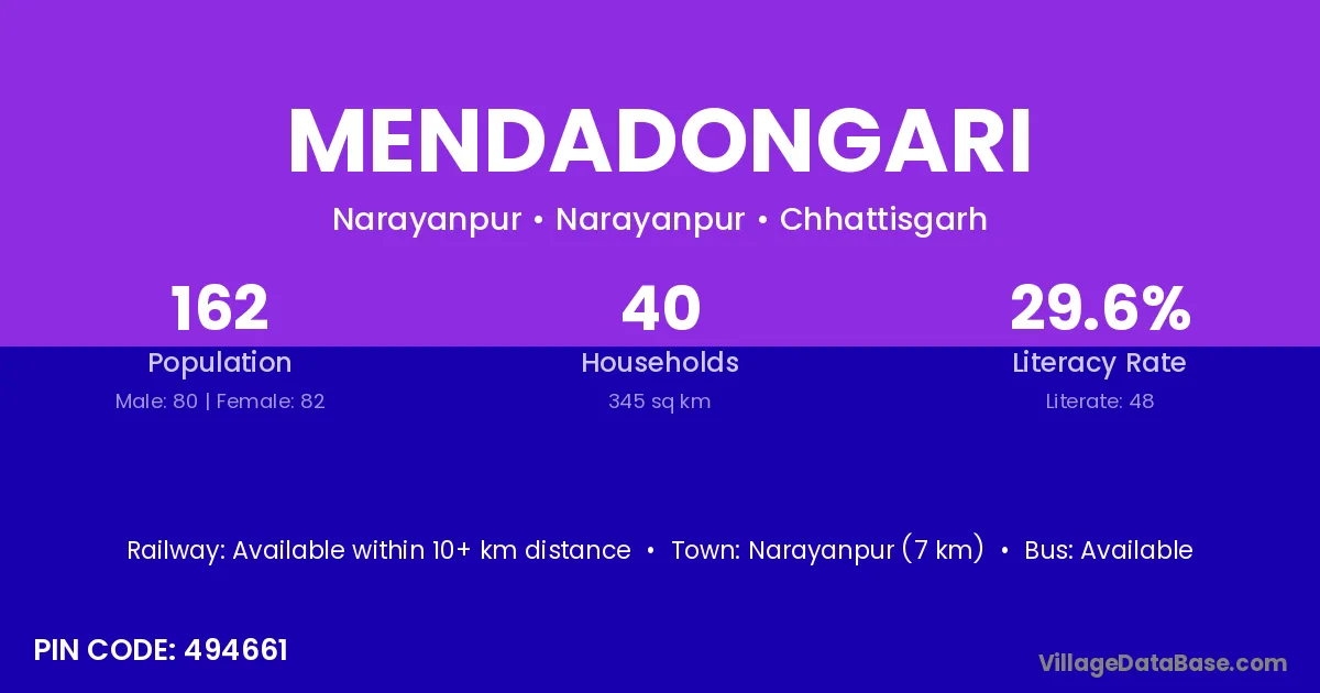 Narayanpur (7 km) is the nearest town to Mendadongari village for major economic activities and is located approximately 7 km away.
