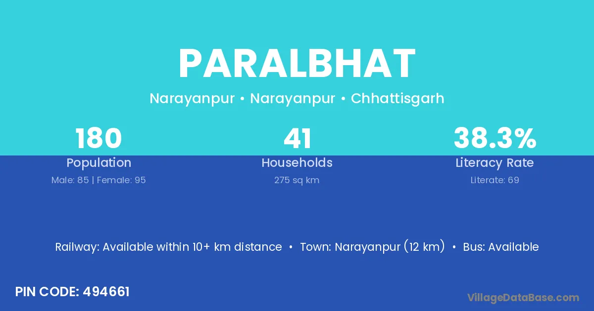 Narayanpur (12 km) is the nearest town to Paralbhat village for major economic activities and is located approximately 12 km away.