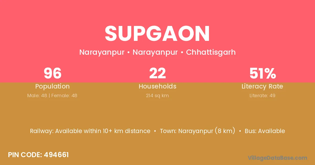 Narayanpur (8 km) is the nearest town to Supgaon village for major economic activities and is located approximately 8 km away.