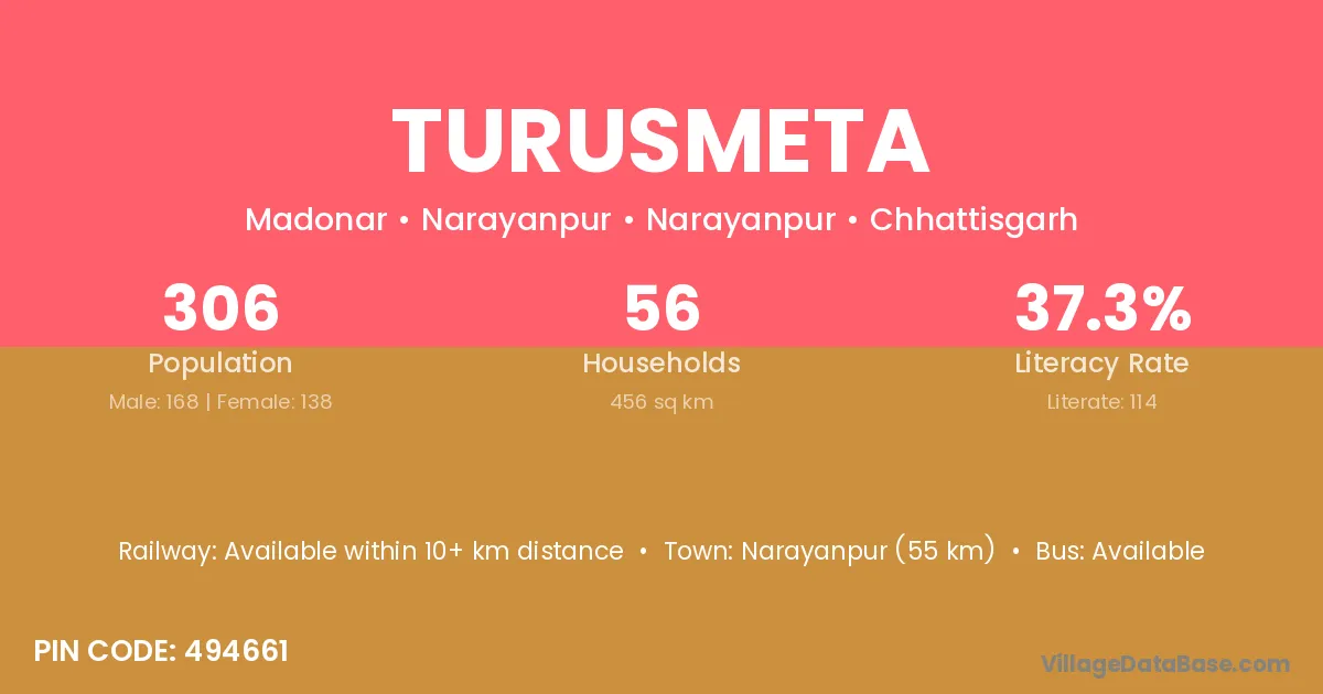 Narayanpur (55 km) is the nearest town to Turusmeta village for major economic activities and is located approximately 55 km away.